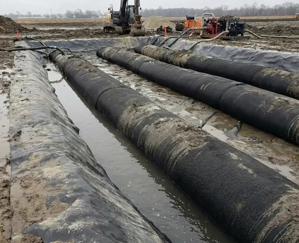 Our sediment dewatering tubes support environmentally responsible dredging by capturing solids while allowing clean water to drain safely. This helps project owners remain compliant with water-quality requirements set by local agencies and regional watershed authorities. Whether working near wildlife-sensitive wetlands, community lakes, or regulated waterways, these geotextile tubes help limit turbidity and protect downstream ecosystems.