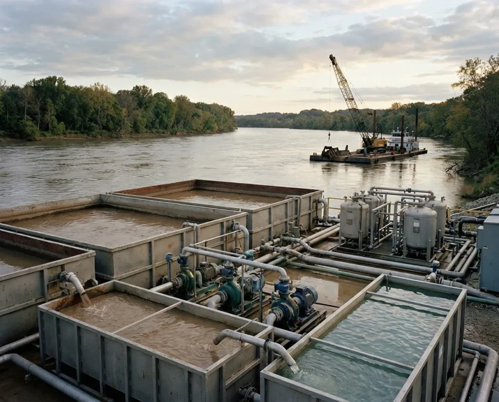 Water pulled during dredging is first passed through screens and coarse filtration to remove debris and large sediment. This protects downstream systems and creates a stable starting point for water treatment services in Kentucky.